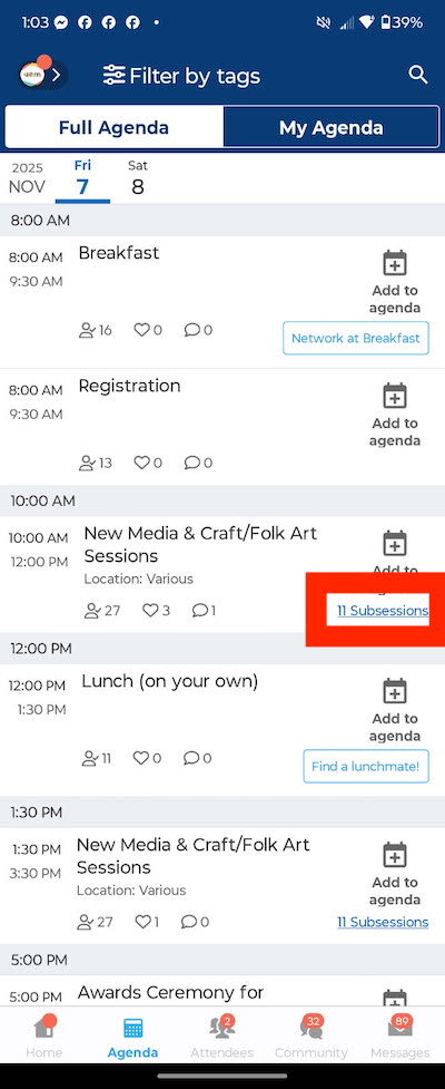 2. For SATURDAY items, find the first "lettered" session(ie Session A), for FRIDAY items, find the first "numbered" sessions (ie Session 1) and click the Subsessions link